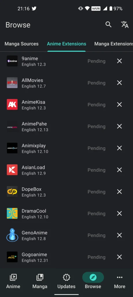 A diferencia de otras apps, Aniyomi no aloja contenido propio. En su lugar, usa extensiones que actúan como puentes hacia sitios web existentes:
